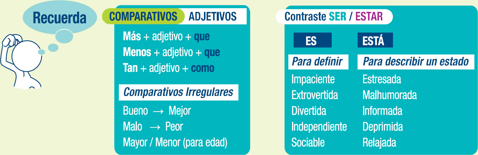 | Además, el carácter de Pepita ha cambiado con su "adicción" al móvil. ¿Cómo piensas que era / estaba antes? ¿Cómo es / está ahora? Utiliza alguno de estos adjetivos para completar las frases. |
